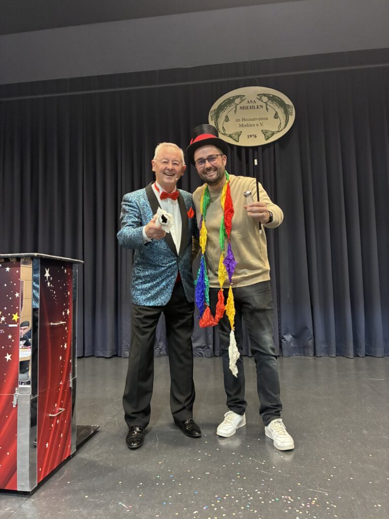 Zwischen Kartentricks, brennenden Geldbörsen, einer gefüllten Einkaufstasche für unseren Ehrenvorsitzenden Helmut fragen sich wahrscheinlich noch immer alle Anwesenden, wie der Ehering in die gut verschlossene Kiste kam, obwohl der Ehemann diesen doch durchgehend zwischen seinen Fingern festgehalten hatte. Große Show Heinz – Hut ab.